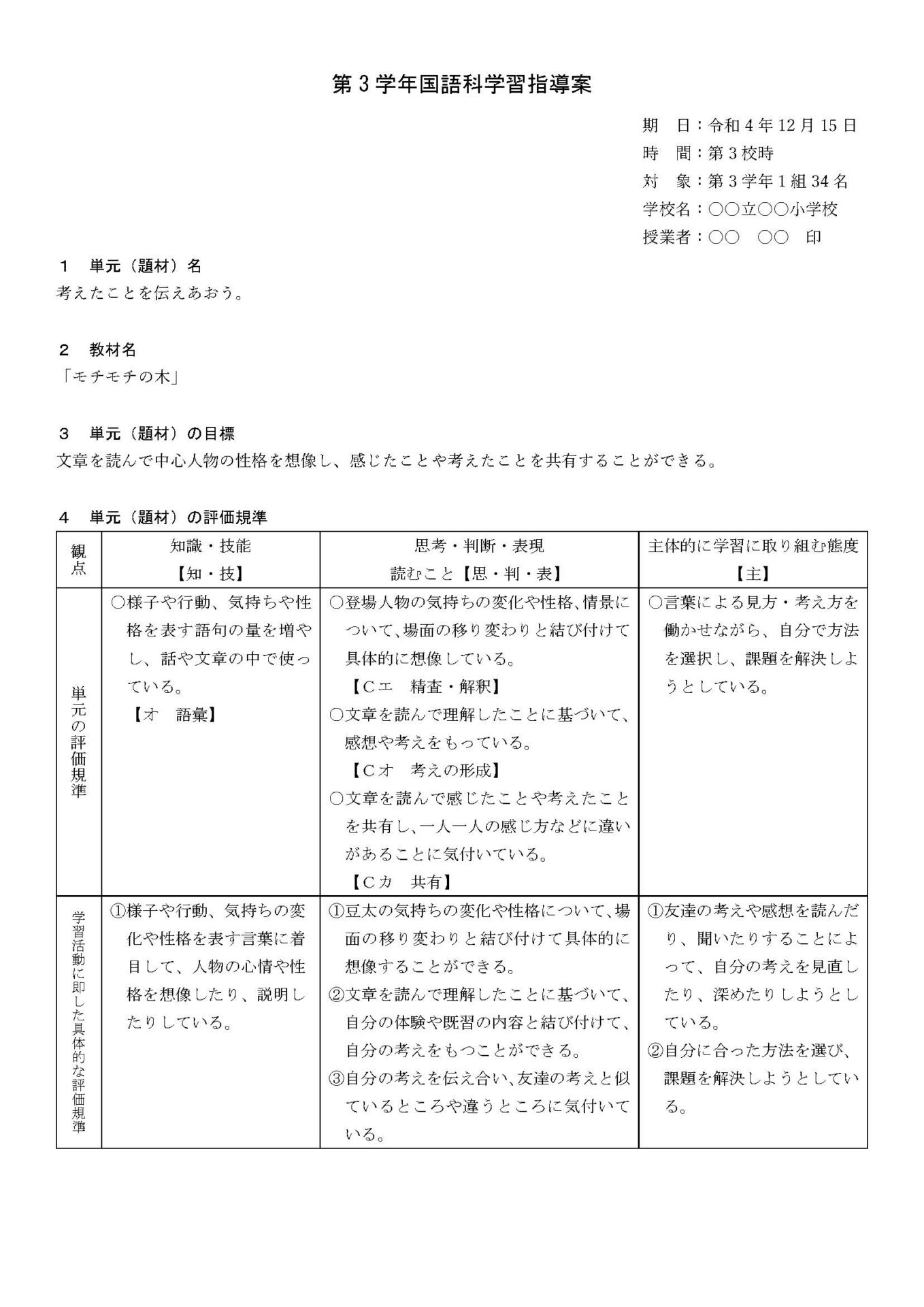 長期的に見た学習の計画を示します。単元全体の目標や評価の規準、指導の計画などです。