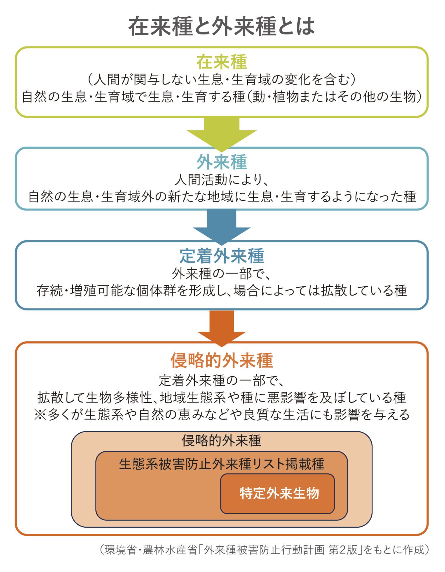 2025年に策定された「外来種被害防止行動計画 第2版」では、2030年までに外来種による負の影響を軽減し、ネイチャーポジティブ(自然を回復軌道に乗せるため、生物多様性の損失を止め、反転させること)の実現に貢献することを目指す姿としています。同計画では未定着の種を予防し、定着した種を拡大させない、定着初期の種を根絶することを全体目標として、外来種への対策に関する役割と具体的な行動について設定しています。