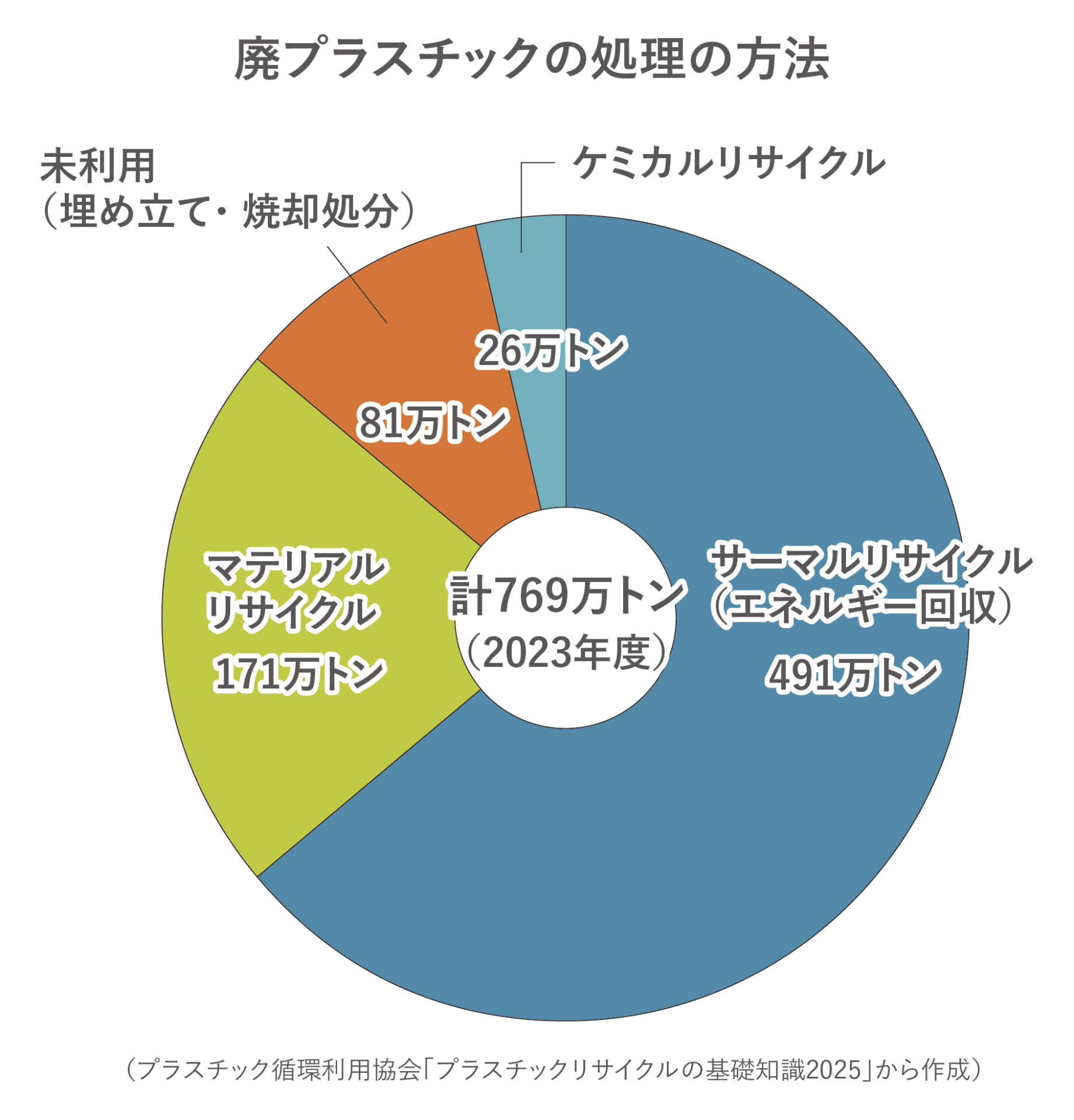 この法の施行によりプラスチックごみを適切に処理していくことに加えて、プラスチック製品の使用そのものを削減していくことや使用済みのプラスチックを再利用していくこと、代替製品を開発・利用することなどが取り組まれています。 プラスチックごみをリサイクルしていく方法としては、大きく分けて①マテリアルリサイクル、②ケミカルリサイクル、③サーマルリサイクルの3つがありますが、現状ではサーマルリサイクルが割合の多くを占めています。