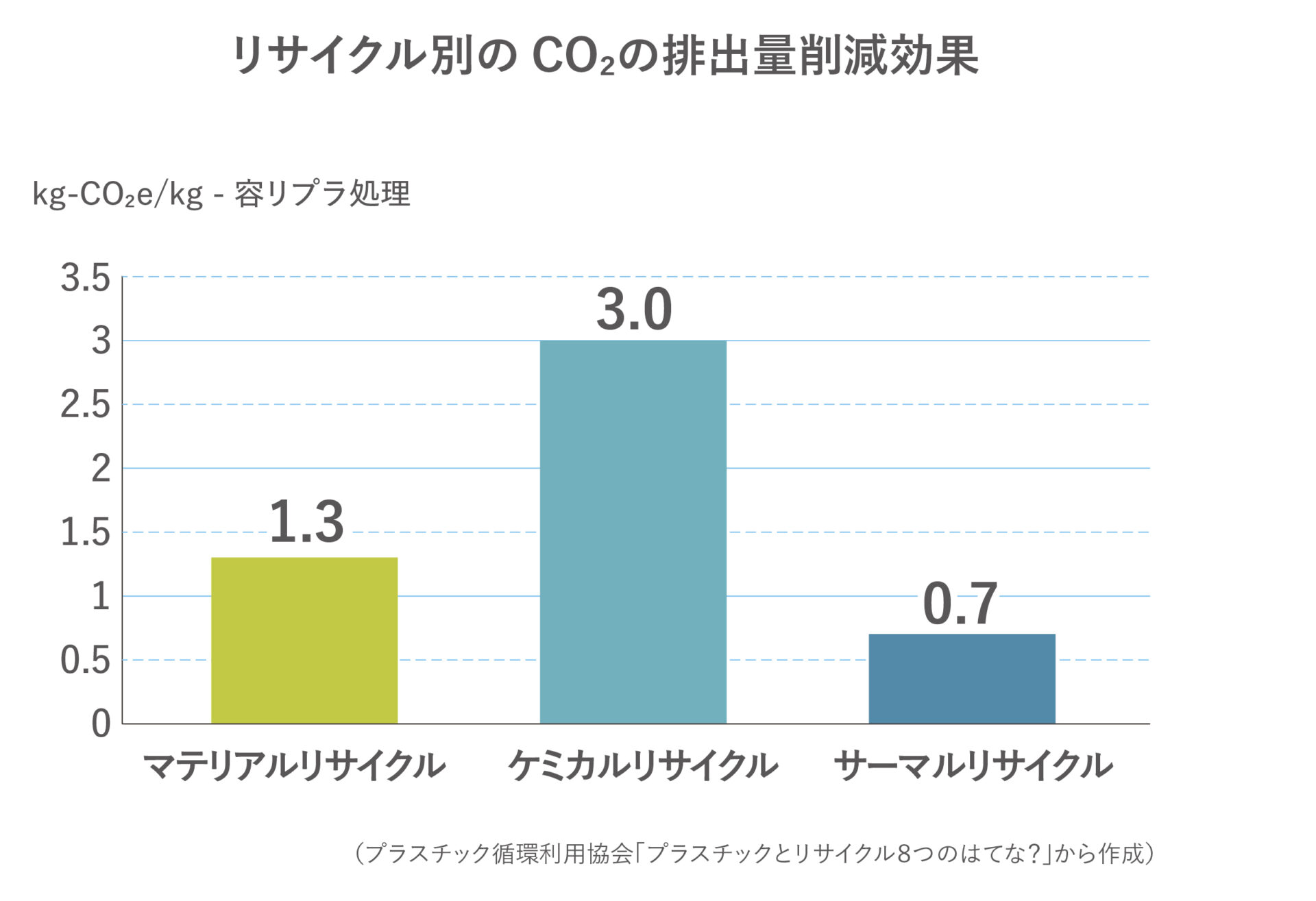 前述したサーマルリサイクルは確かに大切な熱エネルギーにはなりますが、一度燃やしてエネルギーとして使用してしまうとそれでなくなってしまいます。一方のマテリアルリサイクルやケミカルリサイクルで再生プラスチックとして製品になれば、原料が再び活用できるのです。 プラスチックごみをサーマルリサイクルとして利用するよりも、マテリアルリサイクルやケミカルリサイクルとして活用したほうが二酸化炭素(CO₂ )の排出量の削減効果が高いという結果もあります。資源の有効活用だけでなく、CO₂ 削減の観点からも再生プラスチックの割合を増やしていくことは有効であると言えるでしょう。